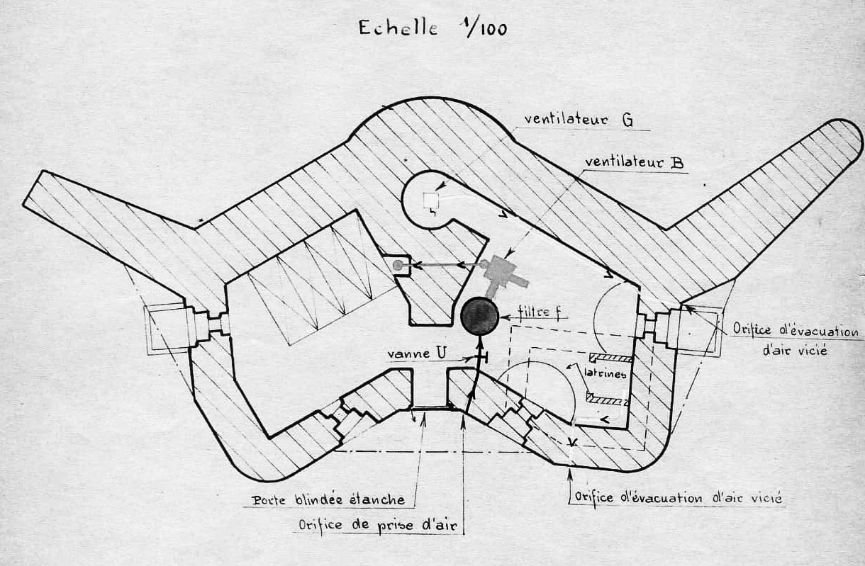 La ventilation était assurée par un ventilateur à bras ou à pédales. Un filtre papier-charbon actif assurait le traitement de l'air en cas d'attaque par gaz.