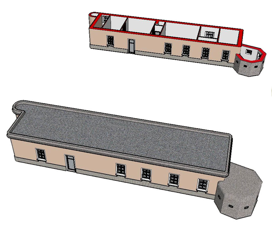 Le blockhaus FM et la façade arrière du casernement. Accolé à la façade arrière, le garage aujourd'hui disparu