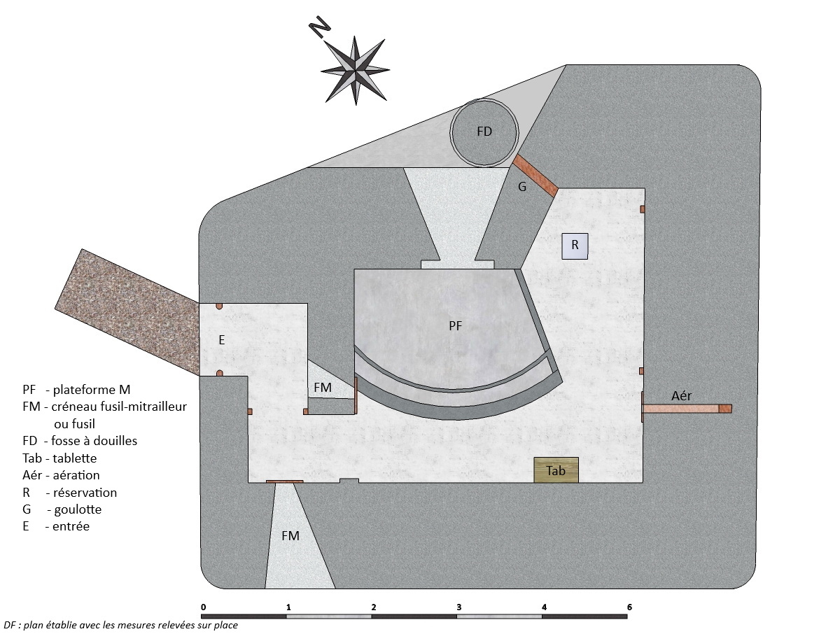 Une plateforme surélevée, en béton, sert de support de la mitrailleuse. Sous cette table, un espace permet le stockage des munitions.