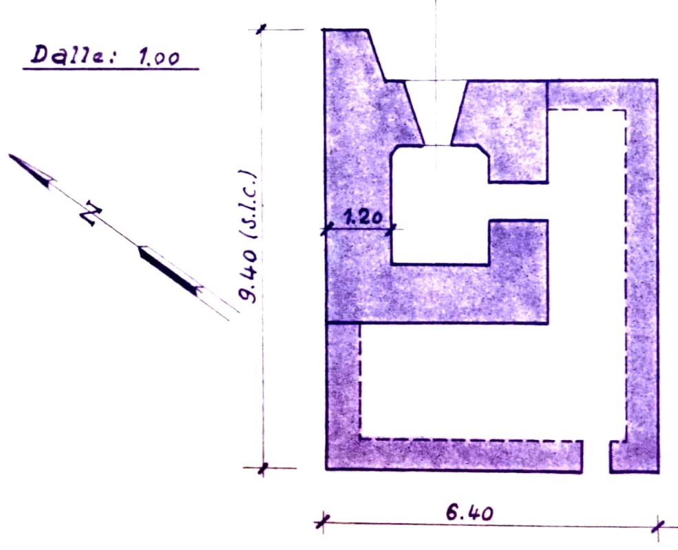 Blockhaus MOM simple pour mitrailleuse, de plan-type flanquant à droite, mais positionné en action frontale. Une avancée en cours de construction et inachevée entoure le bloc côté entrée.