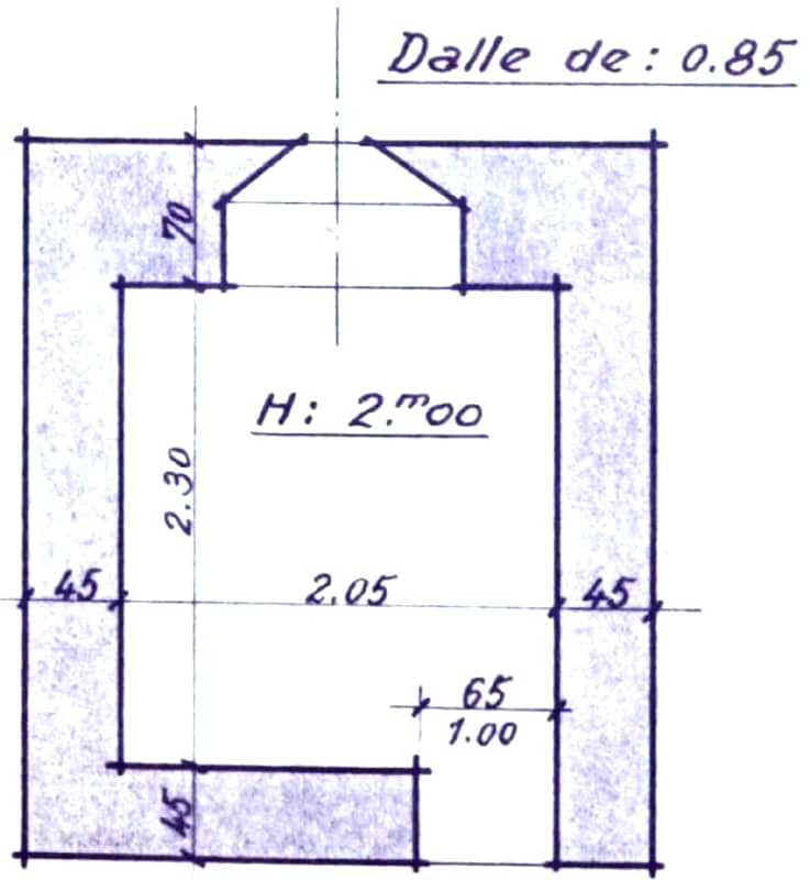 Ces dimensions sont de 3 x 3,5 m, avec piédroit frontal de 0,70 m, latéral de 0,45 m et dalle de 0,85 m.