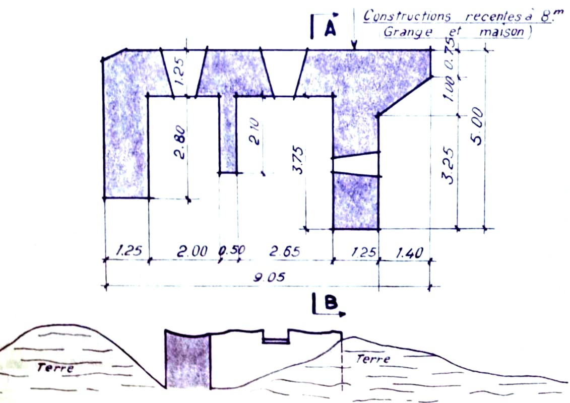 Les piedroits font 1,25m d'épaisseur. L'épaisseur de dalle est inconnue suite à sa disparition lors de la destruction du bloc par les allemands durant l'occupation. On peut supposer qu'elle faisait 1,0m d'épaisseur.
