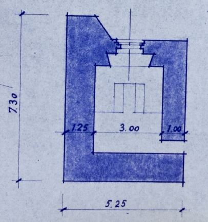 Blockhaus standard MOM-STG type 2, pour canon AC de 25mm, flanquant à droite. Piédroits de 1,25m et dalle en BA de 1,00m d'épaisseur.