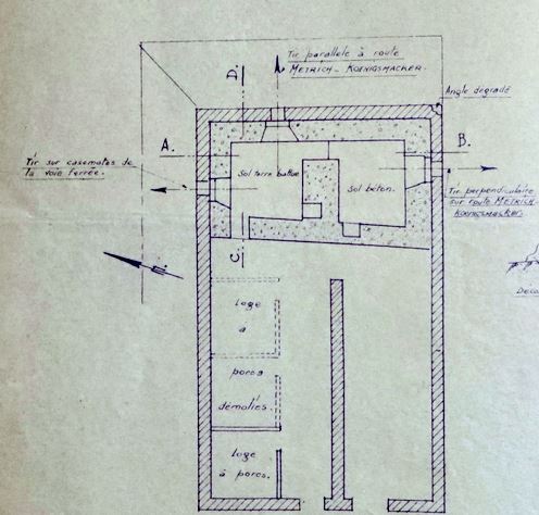 Blockhaus pour FM constitué par renforcement intérieur d'une cave d'habitation à vocation précédente de porcherie. Le bloc est constitué de deux pièces desservant trois créneaux : un frontal sur la route de Sierck, un flanquant à gauche vers les casemates de KOENIGSMACKER, et le dernier flanquant vers la route.