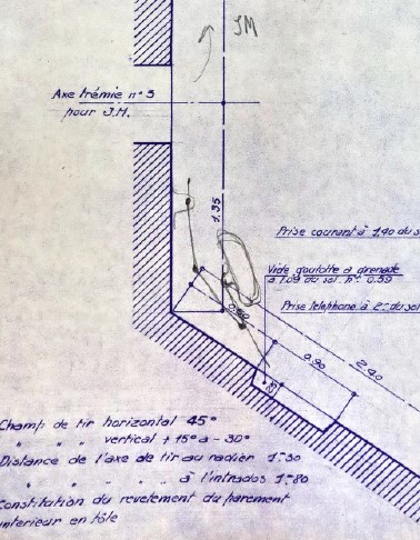 Les tampons de trémies étaient déjà une vieille histoire (commande de fourniture passée) quand des essais d'orientation concernant le "bras manipulateur" ont été fait à Satory début 1937 (à ne pas confondre avec les photos en début de ce fil du montage de Bourges qui est largement antérieur à ces essais-là). Ces essais de bras articulé ont été suffisamment encourageants pour qu'à partir de Mai 1937 le SEMG demande à toutes les chefferies du Génie de recenser les trémies concernées et les dimensions disponibles sur les murs côté opposé au pivotement du JM ou de l'AM de créneau. Ci-dessous, tiré d'un épais dossier relatif au SFAM où chaque trémie JM a été étudiée, l'exemple d'un des créneaux de l'ouvrage de Ste Agnés. On y voit bien l'implantation du bras sur le génie civil, avec un système comportant 4 axes de rotation !