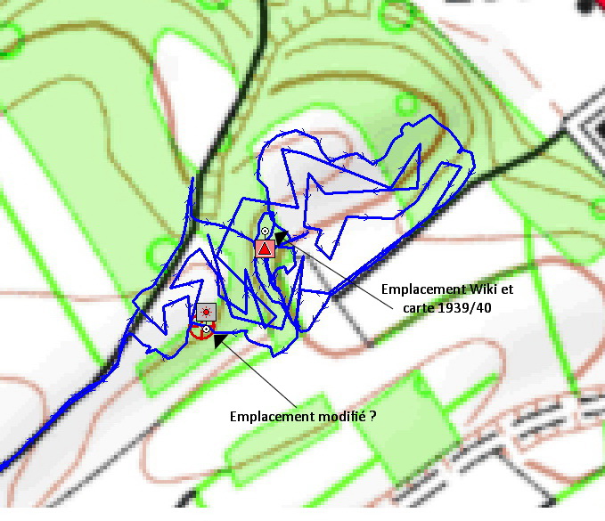 Voici le parcours effectué sur place avec les deux emplacement : celui de Wiki et carte 1939/40 et le second l'emplacement modifié.