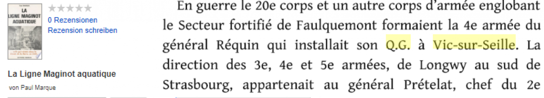 nous cherchons des informations sur le quartier général du général Requin de la 4e armée. En effet ce P.C a été installé dans une ancienne carrière de gypse à Vic-sur-Seille, aménagée par l’armée française avant 1939/40 et mesurée par les allemands en 1944 (d'après les documents du service des mines sur les usines souterraines du département Moselle).