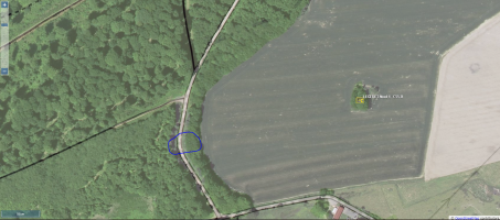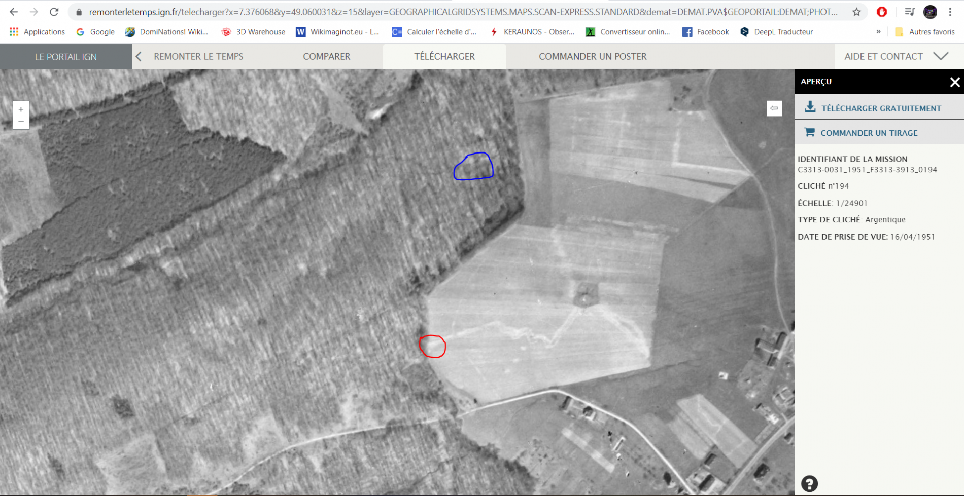 De plus, j'ai fais un tour sur Remonter le temps (site IGN) et j'ai vu ce qui semble être une tranchée partant d'un autre blockhaus vers l'emplacement de l'actuel chemin (cercle rouge) qui pourrait être l'emplacement du blockhaus alors que le positionnement sur Wiki (en bleu) est plus profondément dans les bois.