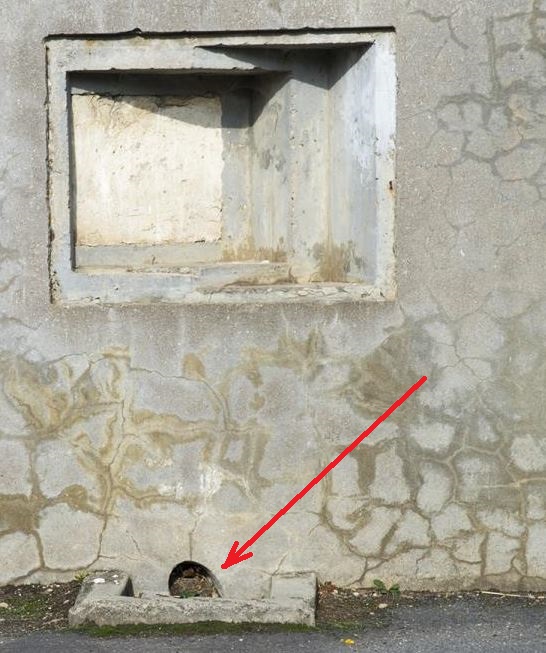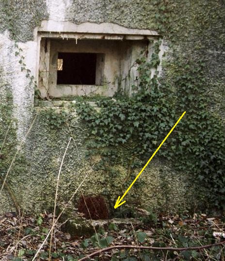DMP : Voir l'équivalent de ce dispositif - un peu plus complet - à LANGTHAL ci-dessous et un schéma d'un système similaire utilisé dans le Sud-Est. Il y avait en principe deux logements dans le vide entre la paroi extérieure et la double porte intérieure, séparés par une paroi métallique verticale, pour les deux cordons (normal et secours). Le pseudo-créneau "DMP" était en principe placé dans une direction non dangereuse car constituait une vraie faiblesse à un coup direct... les taquets de blocage des portes pivotantes était plus psychologiques qu'autre chose !