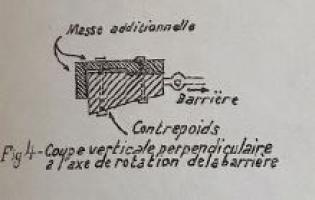 La barrière, normalement verrouillée en position ouverte, tombe naturellement par simple gravité au déverrouillage car son contrepoids est en sous-équilibre. Pour éviter un choc trop violent en fin de course du fait de l'accélération, un système de freinage très simple par frottement d'une corde sur un tambour solidaire de l'axe de rotation de la barrière, décrit dans l'un des additifs, permettait d'éviter éventuellement cela. Ici, cela pouvait être réalisé par simple frottement de la main sur le volant de manoeuvre de l'étage supérieur. Pour faciliter la remontée de barrière, il était recommandé de rajouter une charge sur le contrepoids pour inverser l'équilibre de la barrière. Une simple impulsion de lancement permettait alors de compenser les frottements et la vitesse de remontée était elle-même contrôlée par frottement. Ces mêmes notices donnent par ailleurs les calculs à faire quand le contrepoids de barrière a un axe décalé en angle par rapport à la poutre pour permettre un angle haut (barrière ouverte) plus important sans avoir à creuser une fosse pour le contrepoids.