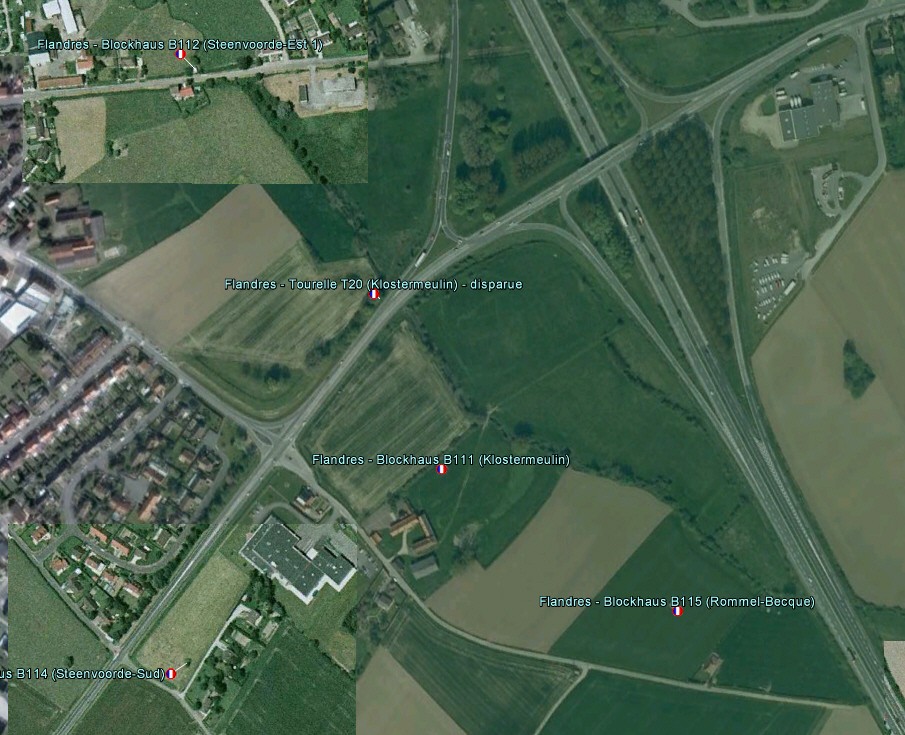-la tourelle T20 se situerait légèrement plus au N-O, entre ce bloc (non indiqué par JD) et le B112-Steenvoorde-Est-1...ce qui correspondrait grosso-modo à la bretelle de l'échangeur de l'autoroute.