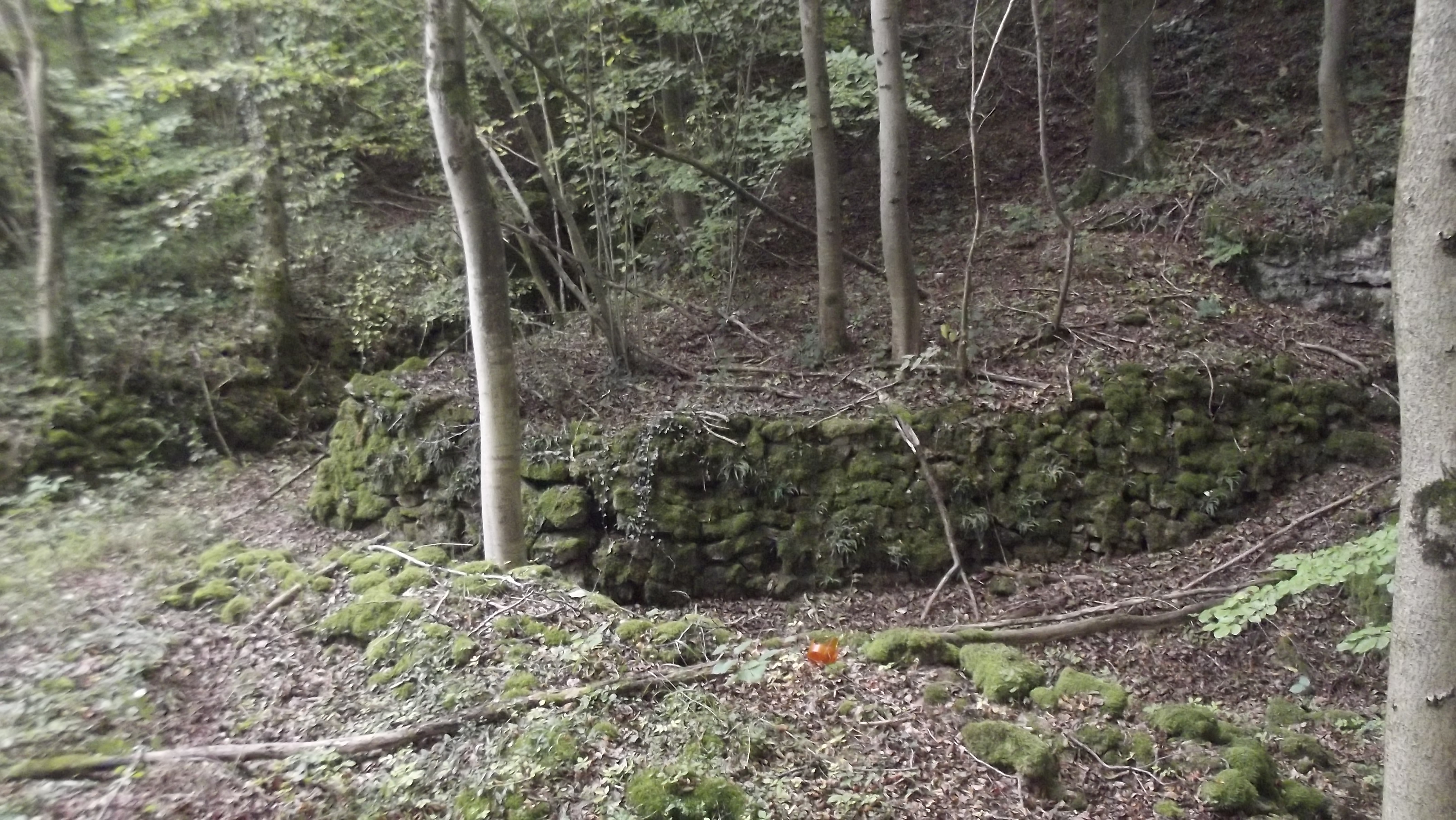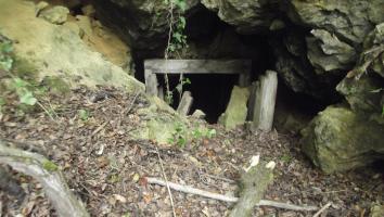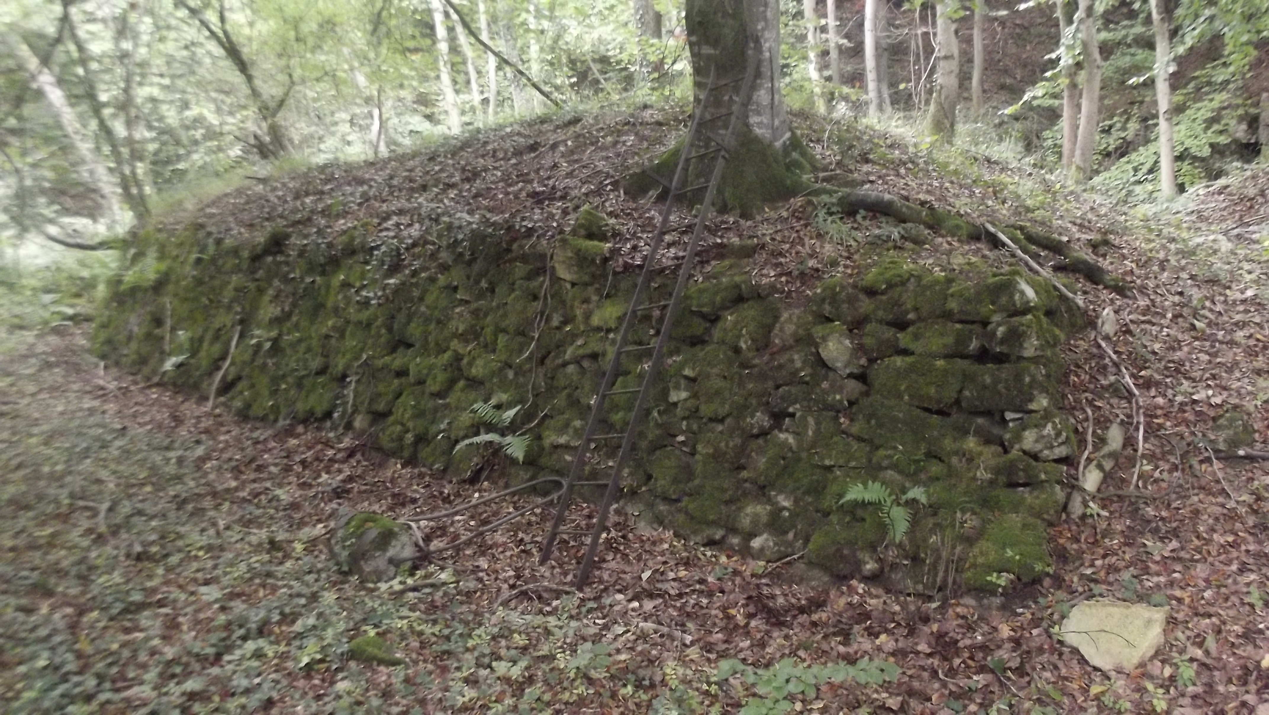 les deux entrées sont effondrées et par la même très, très dangereuses d'accès , on remarque des sacs de ciments agglomérés ,une echelle métallique et des vestiges de murs en pierres ,le tout relié par des tranchées au trois quarts comblées à l'heure actuelle.