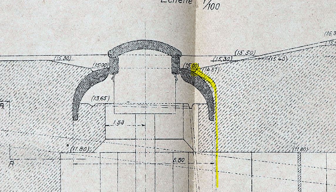 Le design Galgen me parait cependant plus malin que le design de base STG, car il éloigne le point bas et il draine l'eau au loin de la collerette et au loin de l'avant-cuirasse. Il donne davantage de marge en cas de bouchage de l'évacuation. La contrepartie est probablement une moins bonne protection de l'avant-cuirasse par le béton. Peut-être est-ce la raison de ce bombement avec canaux de drainage radiaux.