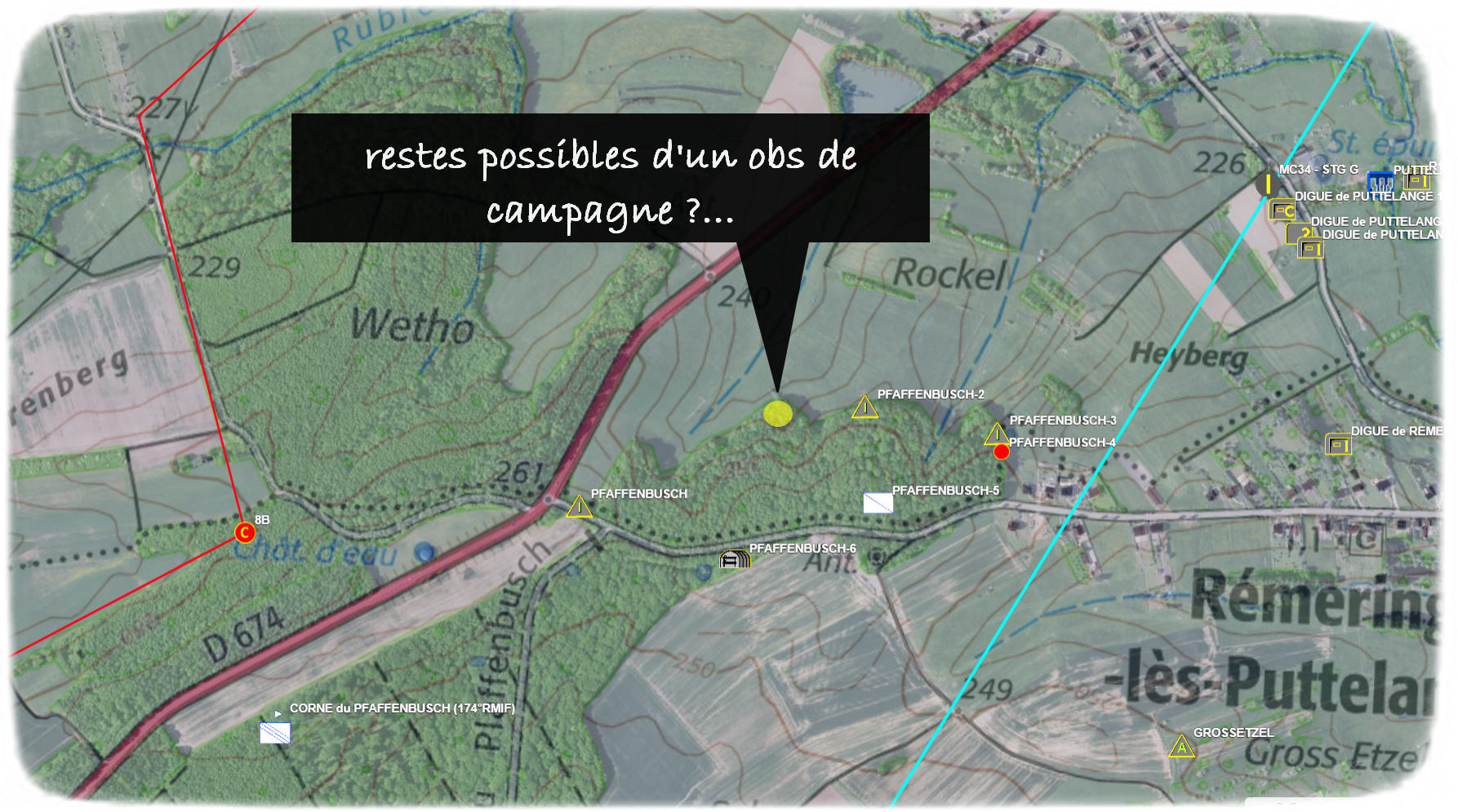 il y a des restes..."bizarres" à côté du pfaffenbush 2....plus au nord à une corne du bois...pas très loin du 2....je ne sais pas si ce sont les restes ou pas d'un "obs de campagne" ?....je vous joins les photos ..il n'est pas référencé sur wiki machin.....vous êtes plus calés que moi ,vous me direz ce que vous en pensez...merci bien et bonne journée à vous tous. amicalement. sylvie- laure .