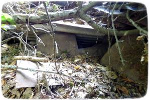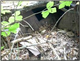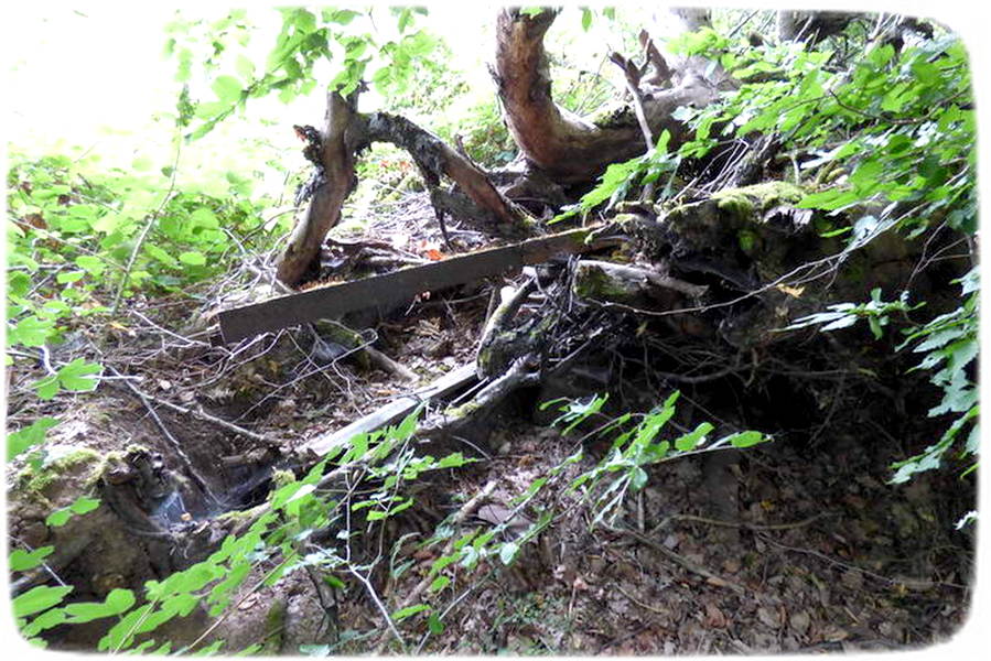 La plaque avec découpe semble fine et le bidon (mais est-ce bien un bidon ?) à côté est peu militaire, tout comme la tôle ondulée plane qu'on voit au-dessus. L'armée utilisait plutôt du cintré en plus grande épaisseur, qui résiste mieux. La position dans un creux de terrain est aussi moins favorable pour un observatoire que celle de Pfaffenbusch-2, pile sur la crête du mouvement de terrain.