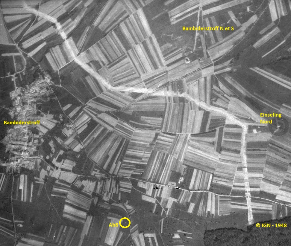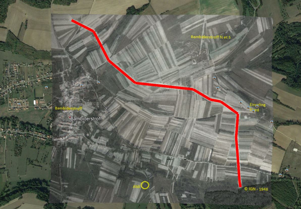 Il y avait bien un important fossé antichar, mais assez éloigné en avant de Ab8. Ce fossé en cours de remblaiement/nivellement est bien visible sur les photos aériennes de 1948 (1e image). Ce fossé a été commencé lors de la mobilisation. Une carte de renseignement allemande, datée de 25 Novembre 1939, marque bien le début de réalisation du fossé en question (2e image). La carte identique précédente datée d'Aout 1939 ne montre rien. Visiblement, si on en croit la carte allemande, le fossé aurait donc été construit progressivement en partant du nord-est de Bambiderstroff vers le bois de Stocken, d'abord parallèle aux courbes de niveau, puis perpendiculairement.