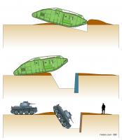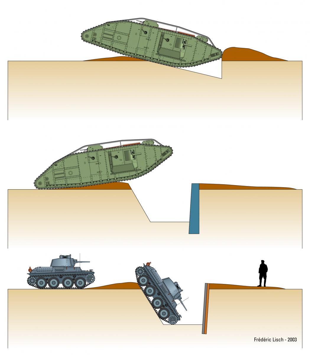 Pour mettre un peu de couleurs à ce sujet, j'amène mon grain de sel avec cette planche illustrant différents types de fossés et les tentatives de franchissement par un Mark V* (char utilisé par les français lors des évaluations d'obstacles antichars) et PzKpfw 38 (t) que l'on a assez vu dans les rangs des divisions blindées allemandes.