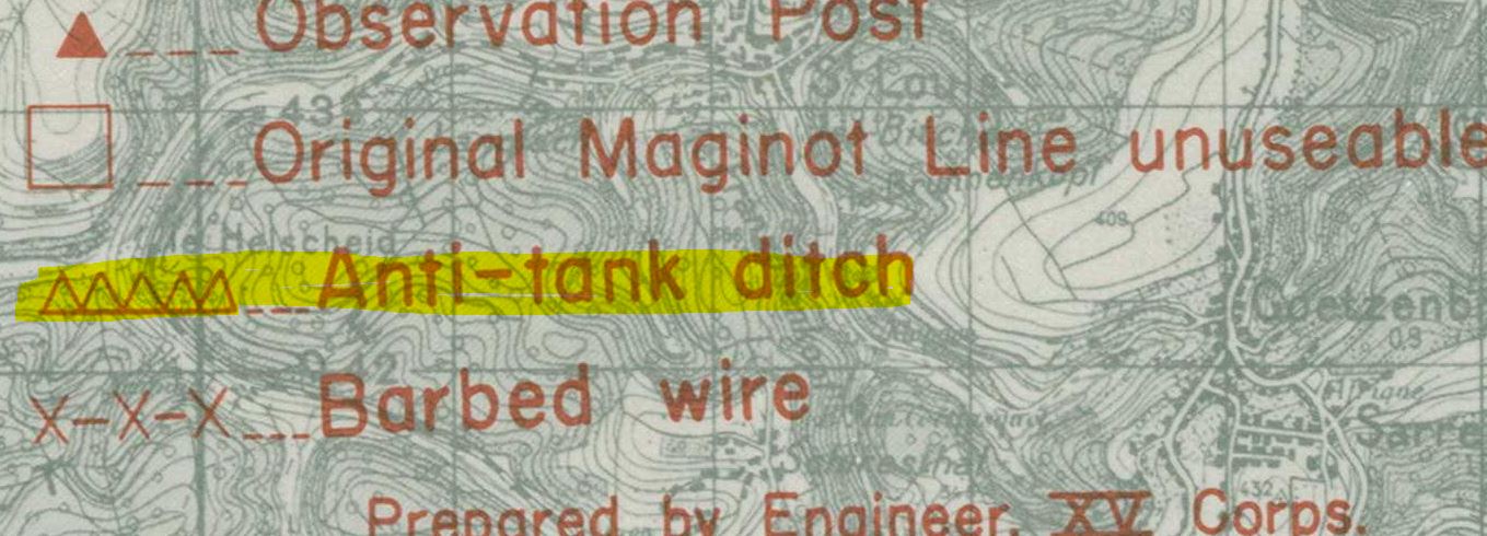 Aucun des rapports que j'ai pu consulter ne place le fossé antichar à l'emplacement du tracé présent sur la carte du Signal Corps (bleu). Connaissez-vous la date précise de sa production ? Est-il clairement précisé sur la carte que ce tracé correspond à un fossé antichar ?