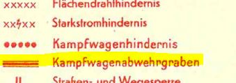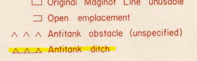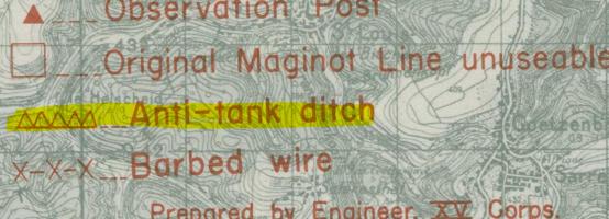 - je vous confirme que ce signe à dents représente bien le signe conventionnel US pour un fossé antichar. Voir la légende ci-dessous, tirée d'autres cartes en ma possession. Celle-ci n'est pas légendée.