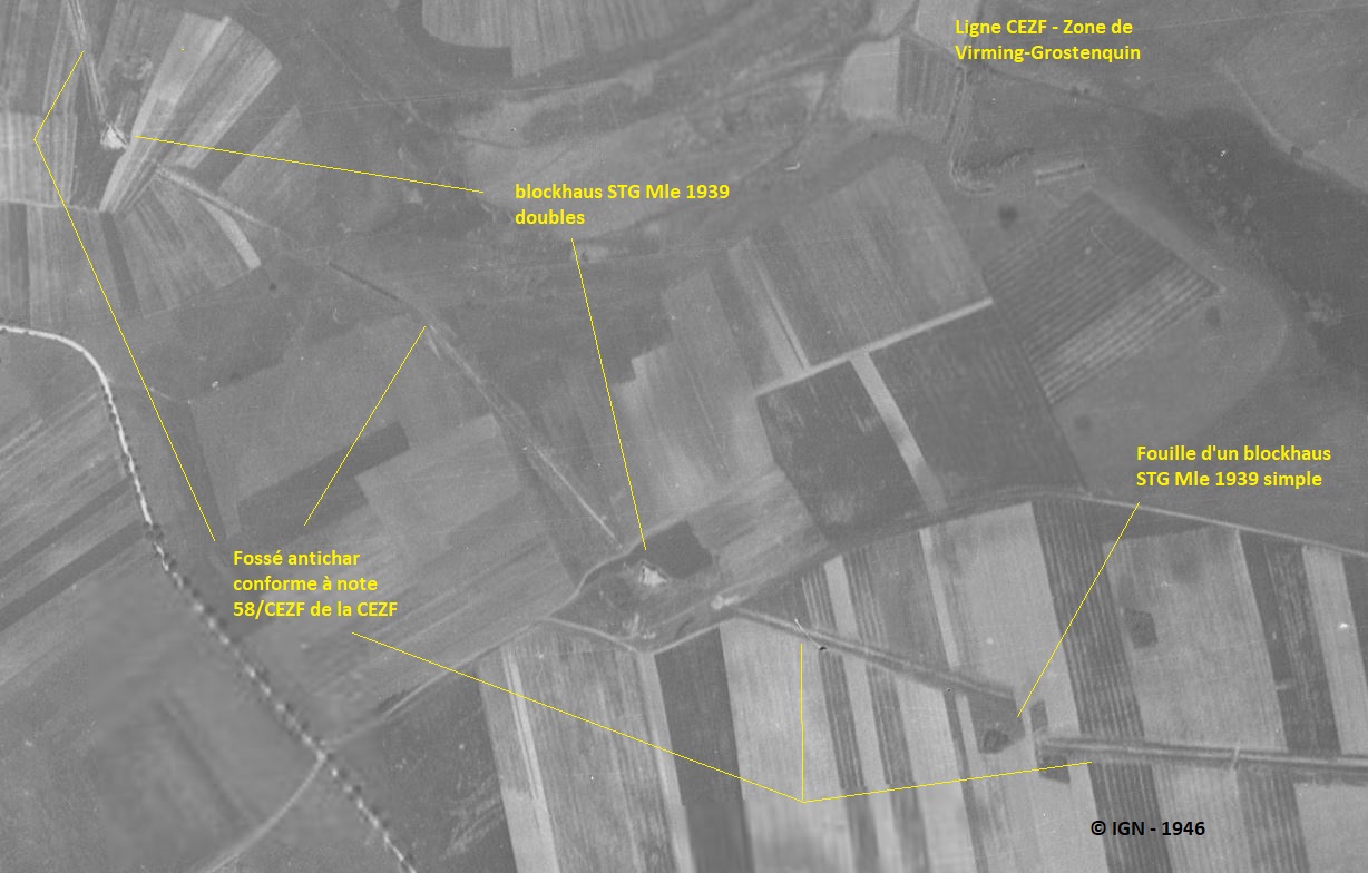 Le fossé du tronçon CEZF Créhange-Guessling-Grostenquin-Francaltroff-Kappelkinger a bel et bien été construit fin 1939 et apparait en clair de façon quasi parfaite sur la carte de renseignement allemande datée du 4 Juin 1940 en notre possession (pièce n°2 et sa légende attestant de la nature "fossé antichar" de ce type de tracé). Ce fossé enfin est tout aussi visible sur les photos aériennes d'après guerre de la ligne CEZF (photos suivantes).