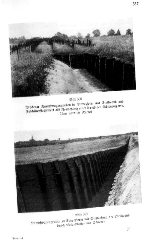 Il était même prévu au départ deux lignes parallèles de blockhaus lourds STG à 1000-2000m de distance, avec chacune son fossé. On ne trouve un début de cela que sur le tronçon Beauclair-Brandeville. Ces fossés étaient au standard de l'armée française, trapézoïdal en terre coulante d'un côté et avec mur vertical tenu de l'autre par des dalles béton tenues par IPN. Profondeur : 2,5m - Largeur au sommet : 5,5 m - largeur au fond : 1,5 m. Le "Denkschrift" allemand de 1941 montre une photo page 337 d'un tel fossé dans son état d'achèvement final (voir + bas) et une autre dans un état probablement intermédiaire avec clayonnage temporaire.