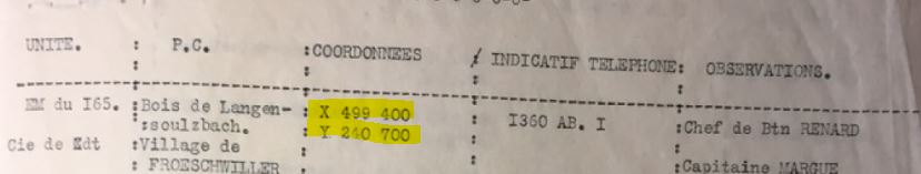 Ci-dessous un extrait d'ordre de bataille du 165° qui localise bel et bien le PC à quelques encablures de là où il est renseigné sur wikimaginot. J'ai converti ses coordonnées LNDG et la vue Google Earth qui suit montre où ces coordonnées le placent.