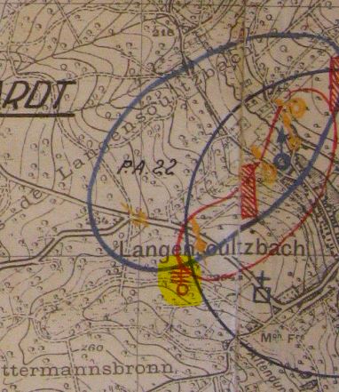J'ai retrouvé une autre carte montrant la localisation du PC du 165° RIF à l'endroit ci-dessus (voir + bas). Il est possible que ce PC se situe bien dans cette même zone boisée sous la maison forestière (qui au passage se nomme Mattermannsbronn aussi...), en fond de vallon à l'intérieur du cercle jaune de ma vue GE.