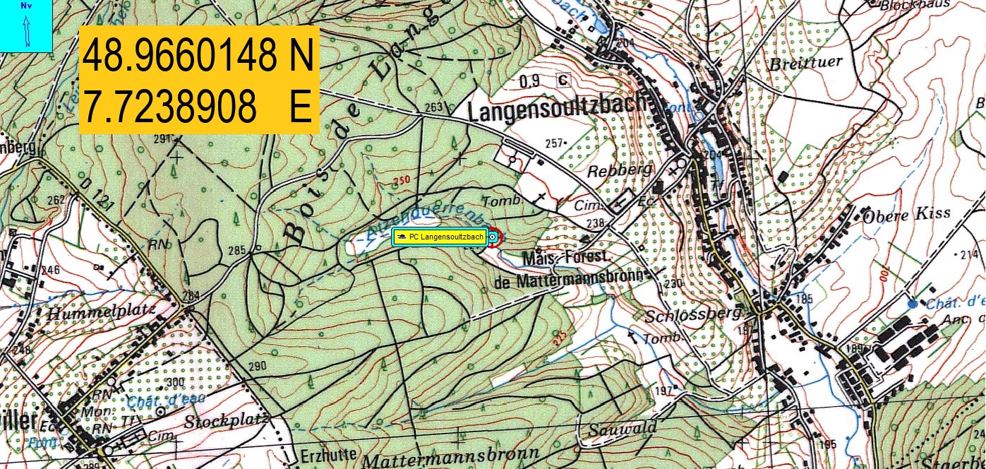 désolé, mais le PC n'est pas au bon emplacement sur aucune de vos carte. J'essaierai de faire un tour ce week-end pour faire quelques photos et prendre les coordonnées GPS. Effectivement la maison forestière non loin s'appelle Matermannsbronn tout comme un puits de l'époque romaine non loin en forêt où l'armée avait enfoncé un tuyau pour récupérer l'eau . Là aussi je peux vous envoyer des photos.