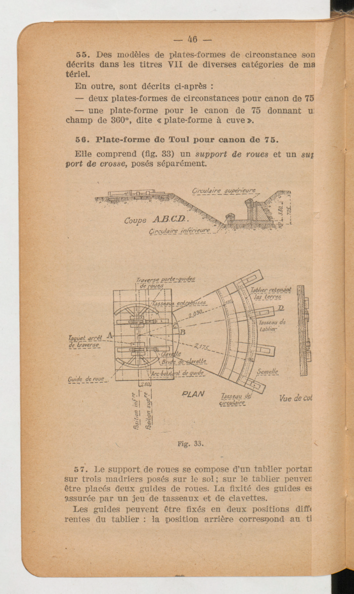 Soit, "Grand quartier général des armées du nord et du nord-est. Etat-major. 3e bureau. Instruction sur l'organisation et la construction des batteries : cette instruction abroge l'instruction de décembre 1916 sur le même sujet. 1918." Page 25 et "Ministère de la guerre. Règlement de manœuvre de l'artillerie. Première partie. Titre XI. L'organisation du terrain par l'artillerie. 1940." page 46.