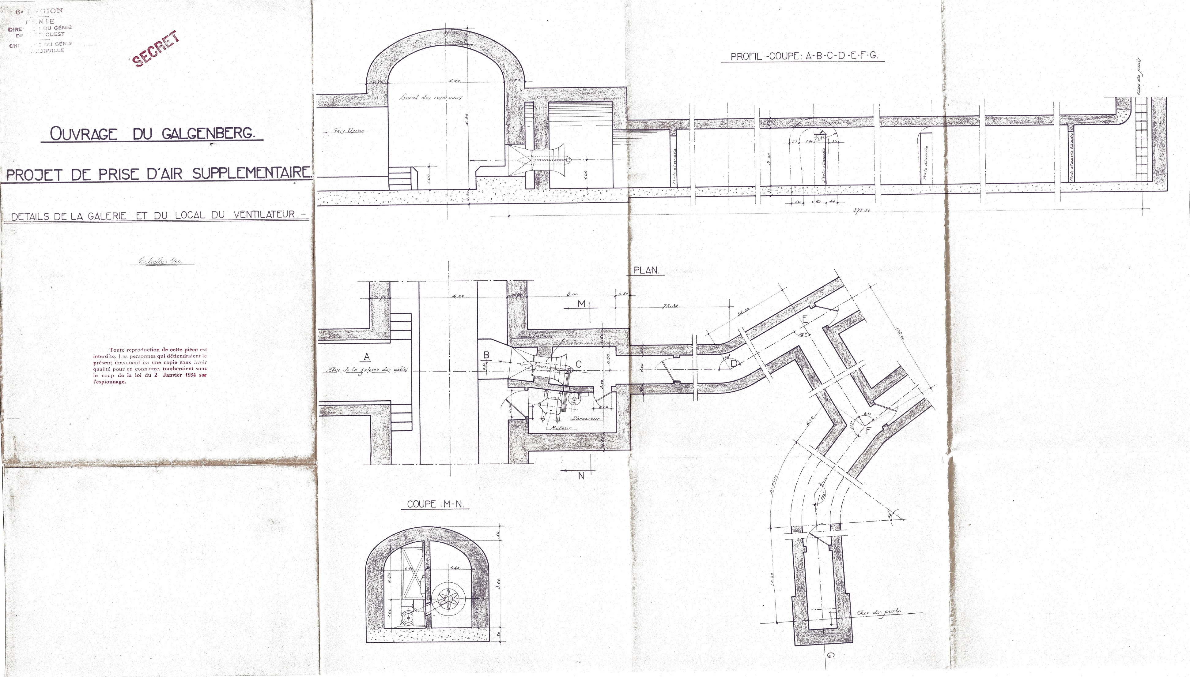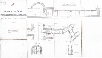 A noter que la branche (du T) de la galerie des câbles qui aurait dû être prolongée vers la prise d’air n’existe pas sur des plans d’ensemble de 1931. Elle est repérée sur un document de 1936, et a dû être ajoutée entre temps pour recevoir la connexion électrique avec le Kobenbusch (noté « K » sur un de ces documents).