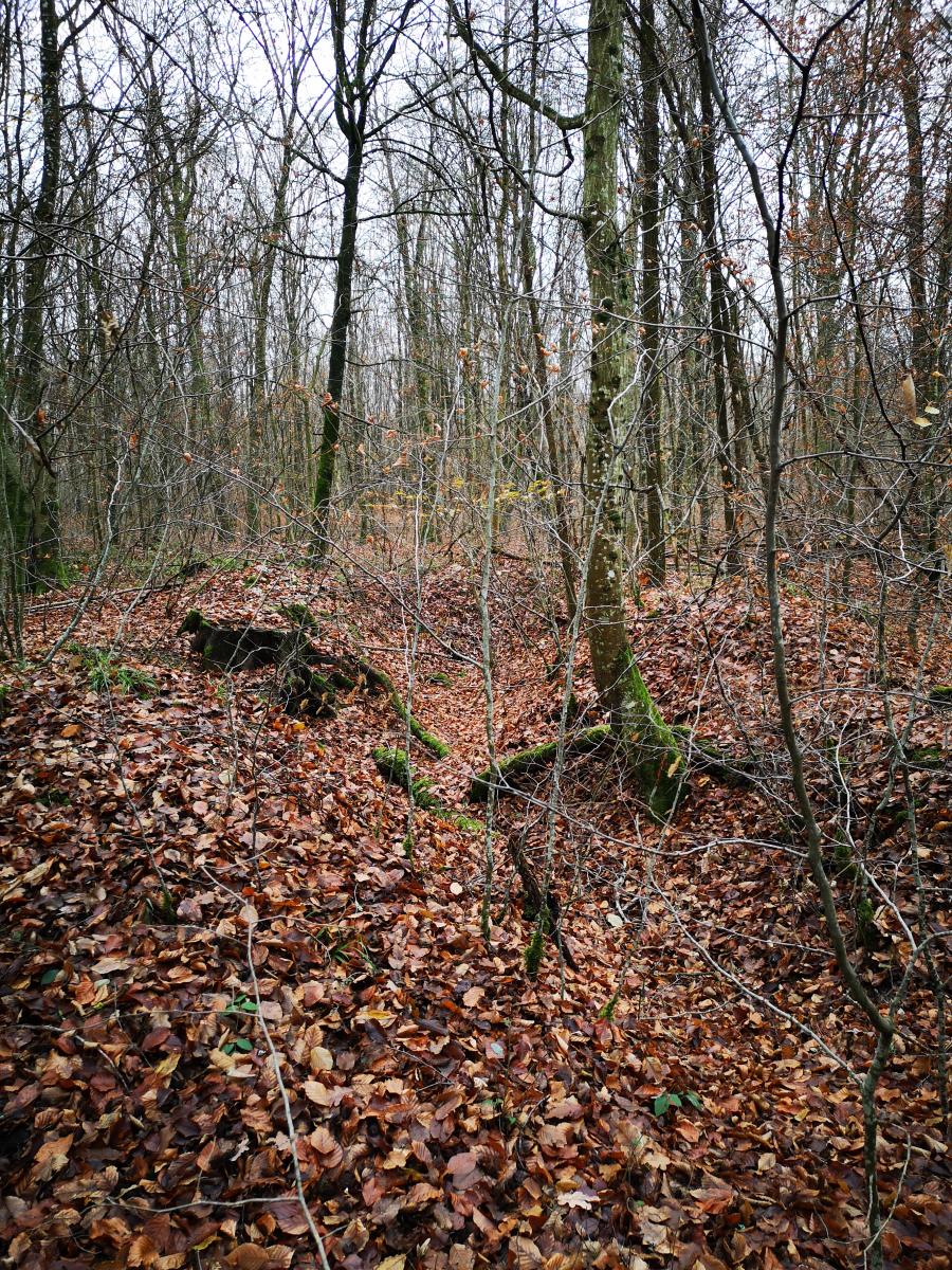 Je suis d'accord sur le caractère à priori inutile de tranchées ici, sauf si on confirme l'origine allemande du site. Là, la proximité du front aurait pu justifier cela. Mais au total j'y crois très peu : selon moi il s'agit plutôt d'anciens caniveaux de drainage d'eau. Les plans types de dépôts de munition français comportent ce genre de dispositifs.