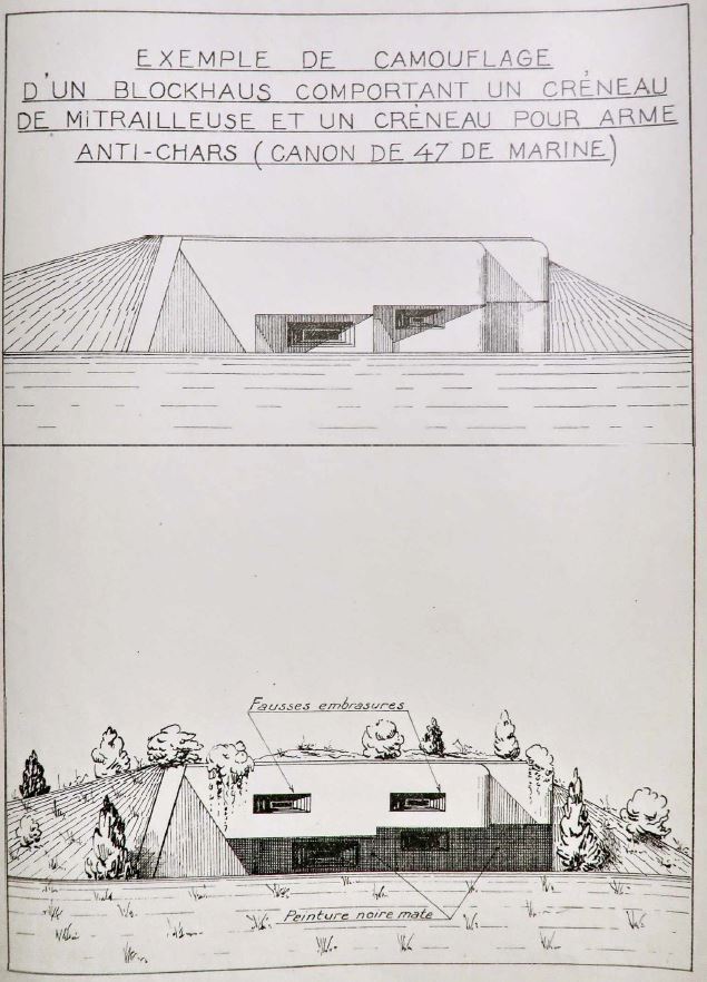 ça c'est une excellente remarque, orientant la discussion dans un sens aussi original que pertinent. Le camouflage officiel des créneaux de blockhaus - tel que défini par la STG en décembre 1938 - était de peindre toute la face sous visière en noir pour masquer la tache sombre des embrasures. En effet, dans ce cas un canon noir se verrait nettement moins.