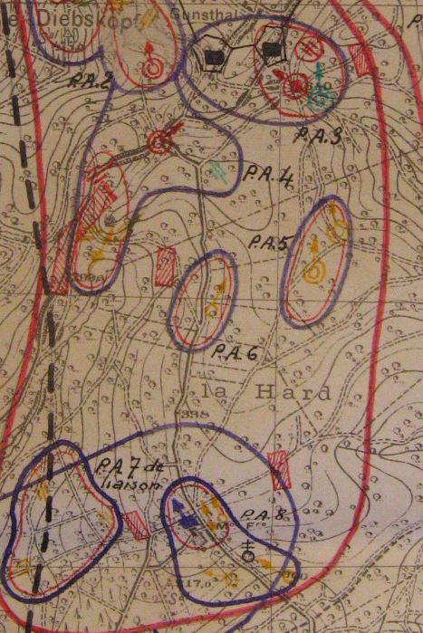 Les cartes renseignées mentionnent un centre de résistance de la Hard (ou Hardt de nos jours) que je pensais n'être équipé que de positions de campagne. La preuve que non.
