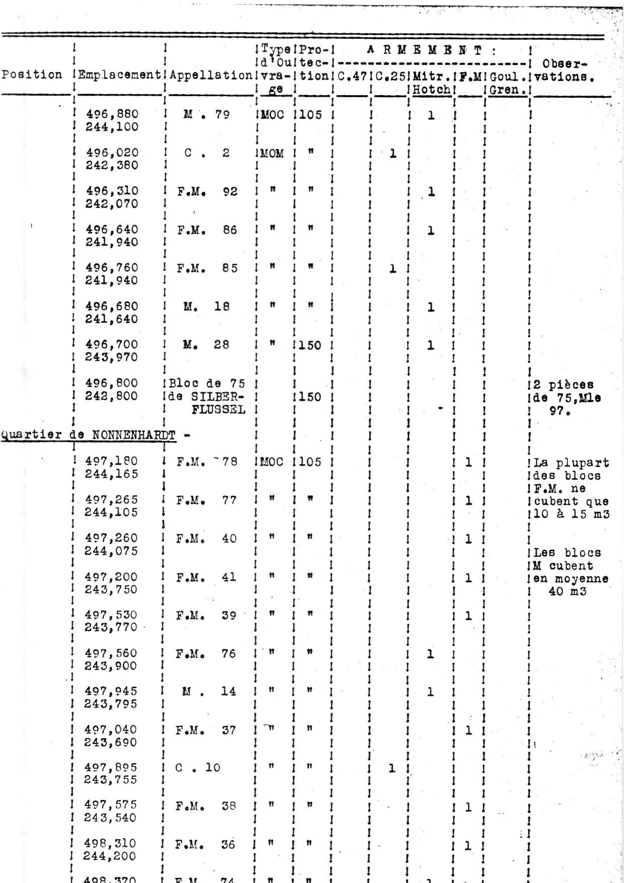 Il est donc possible - comme le pensait Benoit - que le bloc FM37 ait été mal référencé géographiquement dans son document d'archive. Malheureusement, le dossier "Windstein" de la SCOICH ne comporte pas les fiches individuelles des blocs 5, 6, 7 et 8 qui correspondent à FM40, 77, 78 et peut-être 37, donc impossible de creuser plus en avant. Si recherche de terrain il y a à faire, c'est bien en arrière ou aux alentours du bloc FM40 qui doit correspondre au bloc "8" de la SCOICH.
