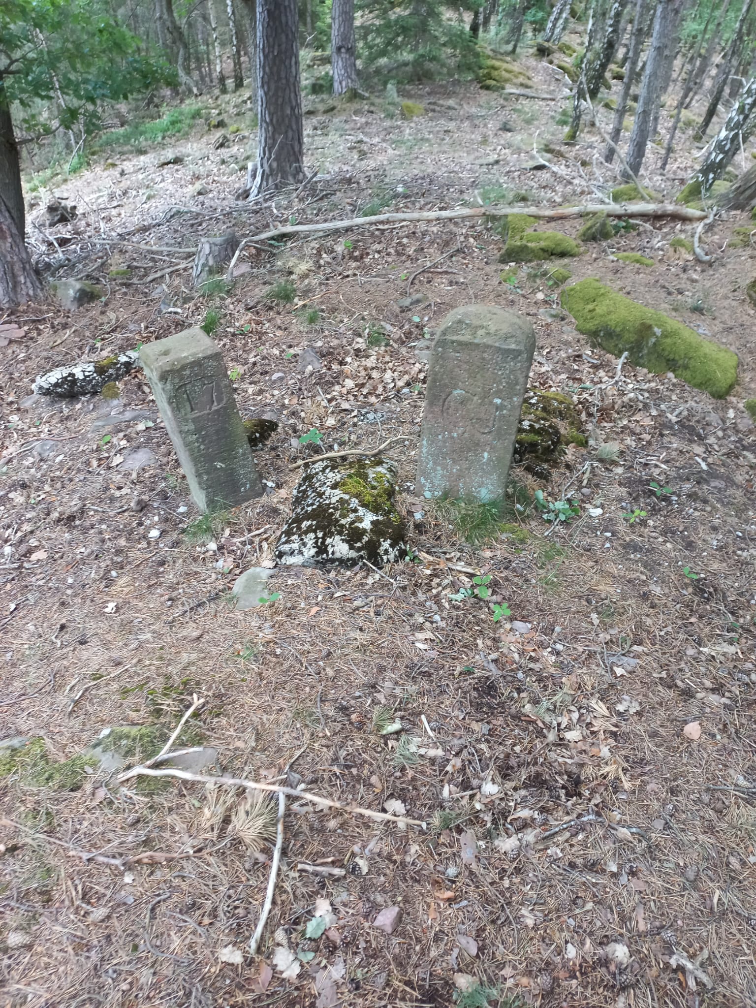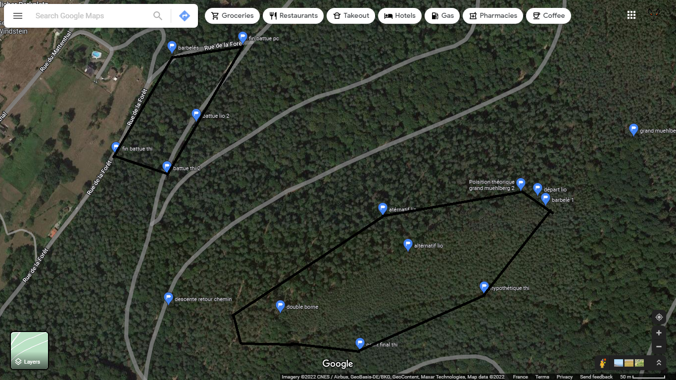 Bonjour, je me suis motivé et j'y suis allé. Lors de la première recherche, je n'ai rien trouvé. J'y suis donc retourné avec la famille pour ratisser plus large. On a ratissé toute la grosse zone du centre (sur l'image qui suit). On a trouvé un bout de barbelé au point indiqué et deux bornes misent côte à côte. L'une des deux bornes (la borne carrée sur l'image ci-après) est identique à celle qui se trouve devant le Grand Muehlberg 1. Nous n'en avons croisé aucune autre de ce type la. Il s'agit peut être d'un ancien emplacement mais sans archive, dur de vérifier.