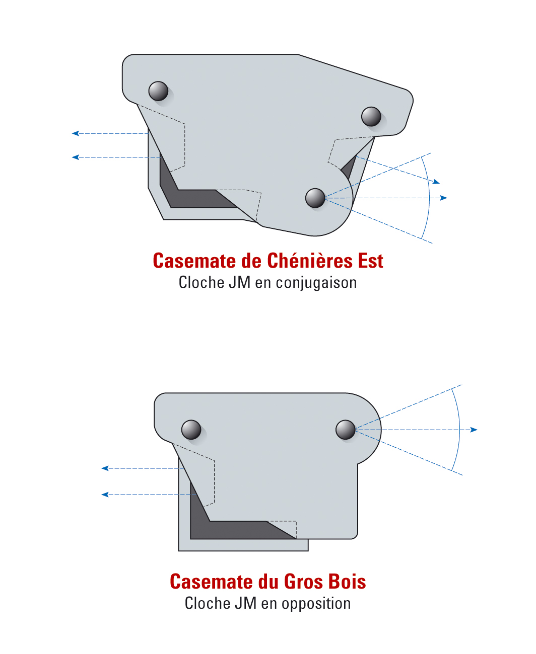 Dans les autres cas, la zone de tir horizontale d'un unique créneau qui est, rappelons le, de 45° est suffisante pour effectuer un appui-feu en opposition de casemate à casemate (voir le petit croquis illustrant une cloche JM en conjugaison avec un JM sous béton et une cloche JM en opposition de la chambre de tir).