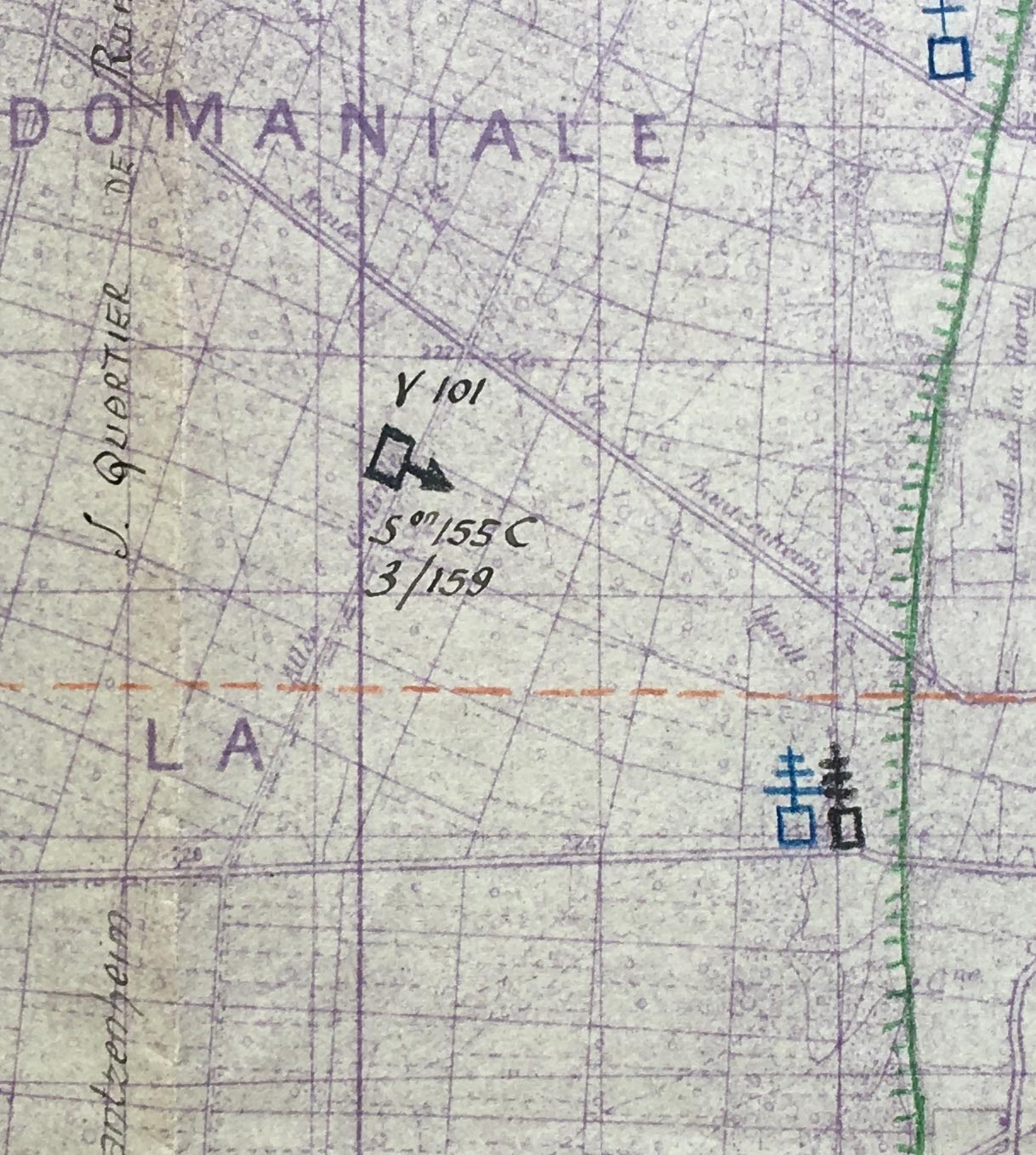 Selon une carte renseignée , une batterie dénommée V101 composée d'uns section de 155C du 3 - 159° RAP était localisée dans le secteur des batteries dénommées Canal de la Hardt.