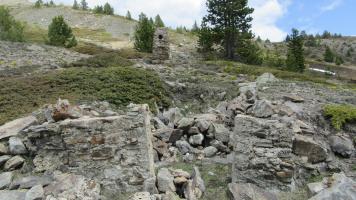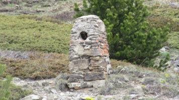 Ruines d'une colonne bizarre en pierre: je pense à un support pour un tuyau d’évacuation de cheminée pour un poële dans l’abri adjacent.