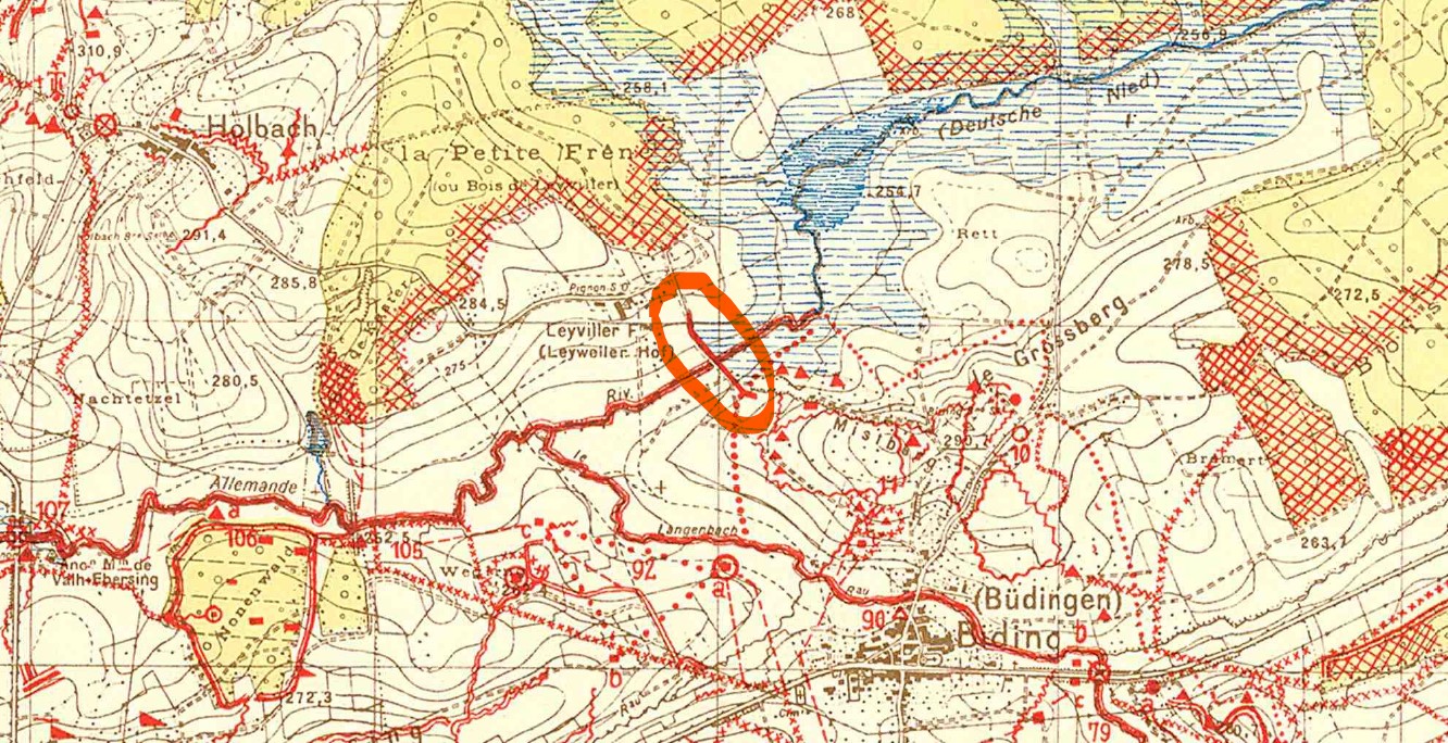 D'autres travaux sont également signalés sur la Nied Allemande au niveau de Biding : sur le pont entre Vahl-Ebersing et Altwiller (D 22, pont à la cote 253), sur le ponceau entre Biding et la ferme de Leyviller (ponceau à la cote 255) et entre l'Allewald et le Bidingerwald, mais là je n'arrive pas à voir où.