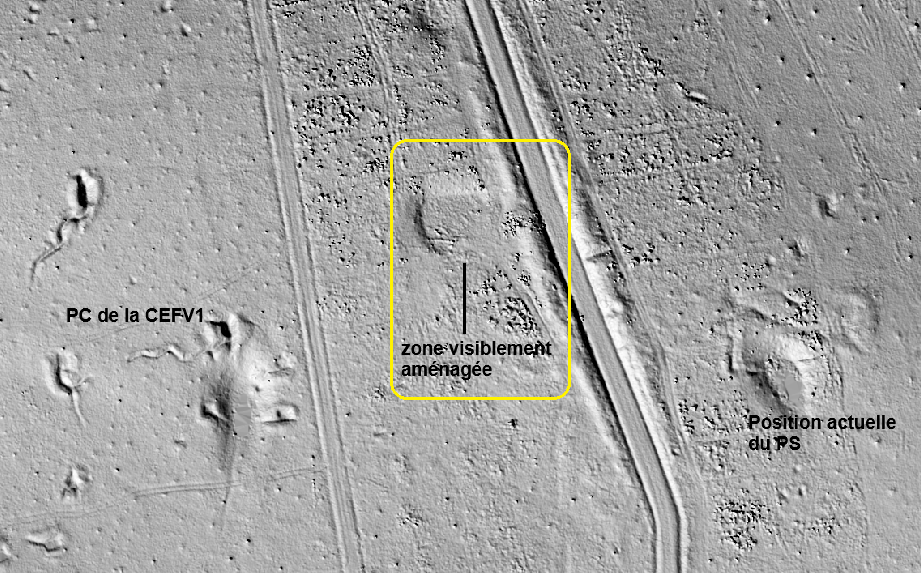 Au relevé lidar, il y a au centre de cette zone un grand cratère avec un trou d'eau (en tous cas quand la vue a été faite). Quelques restes de tranchées sont notables à droite du cratère. Soit un stock de munitions a été fait explosé, soit le PS était ailleurs. Les seules zones organisées du bois sont autour des deux PC de bataillon et de CEFV, mais une aire semble avoir été aplanie le long de la route juste à côté : cela ferait un bon candidat pour un PS fait de tentes ou de structures légères car au moins il n'y a pas loin à faire pour transporter les blessés à partir de la route.