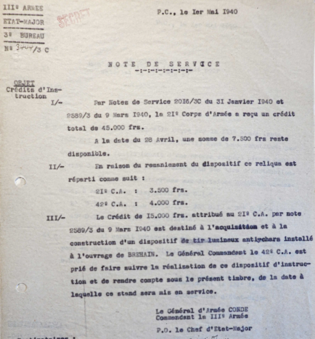 Dans une note de la 3e Armée en date du 1er mai 40 (SHD 29N135) , il est fait mention de la construction d'un dispositif lumineux antichars installé à l'ouvrage de Bréhain. Dispositif d'instruction.