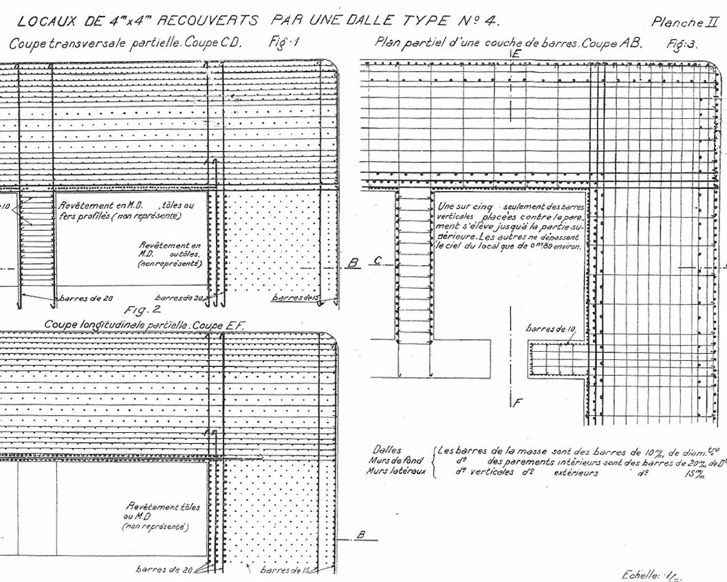 - l'inutilité de viser un ferraillage trop massif et dense car on perd en qualité de mise en oeuvre et de damage du béton et on crée des plans de clivage et un fort risque de discontinuité du béton. En gros, un mauvais ferraillage a un effet pire que pas de ferraillage du tout. Le ferraillage peut cependant avoir un effet bénéfique sur la propagation des dislocations générées par le voyage du projectile dans le béton, et donc de minimiser l'effet de l'explosion en fin de course. La masse de ferraillage maximale recommandée est de 80 kg par m3 de béton en moyenne (100 kg avant-guerre et dans d’autres pays), sous réserve des résultats de essais spécifiques en cours et demandés par une DM de février 1925.