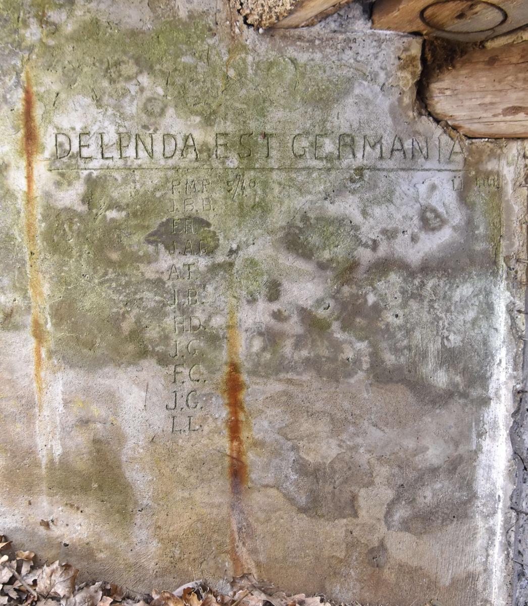 A la vue de mes photos, l'inscriptions "DELENDA EST GERMANIA" et sa liste de soldats P.M.P. S/L - J.B.B. - F.A. - J.A.G. - A.T. - J.B. - H.D. - J.G. - F.C. - J.G. - L.L. datée de Mai 1940. se trouve sur l'abri "BOIS de DESSENHEIM Sud 6".