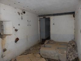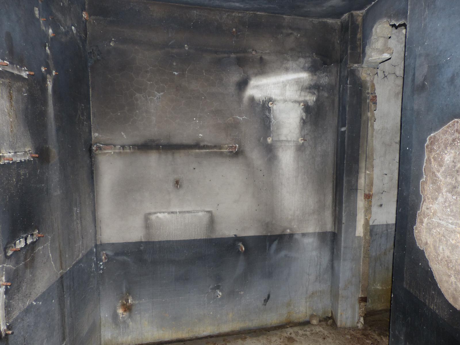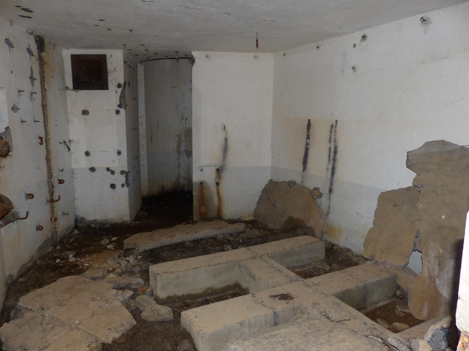La pièce dans le prolongement de la chambre d'officier est celle pour les vivres de réserve. Ces locaux pour vivres de réserve avaient des configurations variables selon les casemates. Pour être un peu caricatural, on le mettait là où on pouvait ! Parfois c'était le local de la caponnière intérieure du couloir d'entrée (Margut, Avioth), parfois dans un local attenant à la chambre d'officier ou sous-officiers (Ecouviez Ouest), parfois c'était placé dans un sous-sol de puits de cloche (St Antoine, Thonne le Thil, Guerlette...), parfois dans un local sous l'escalier entre étages (Christ), etc...