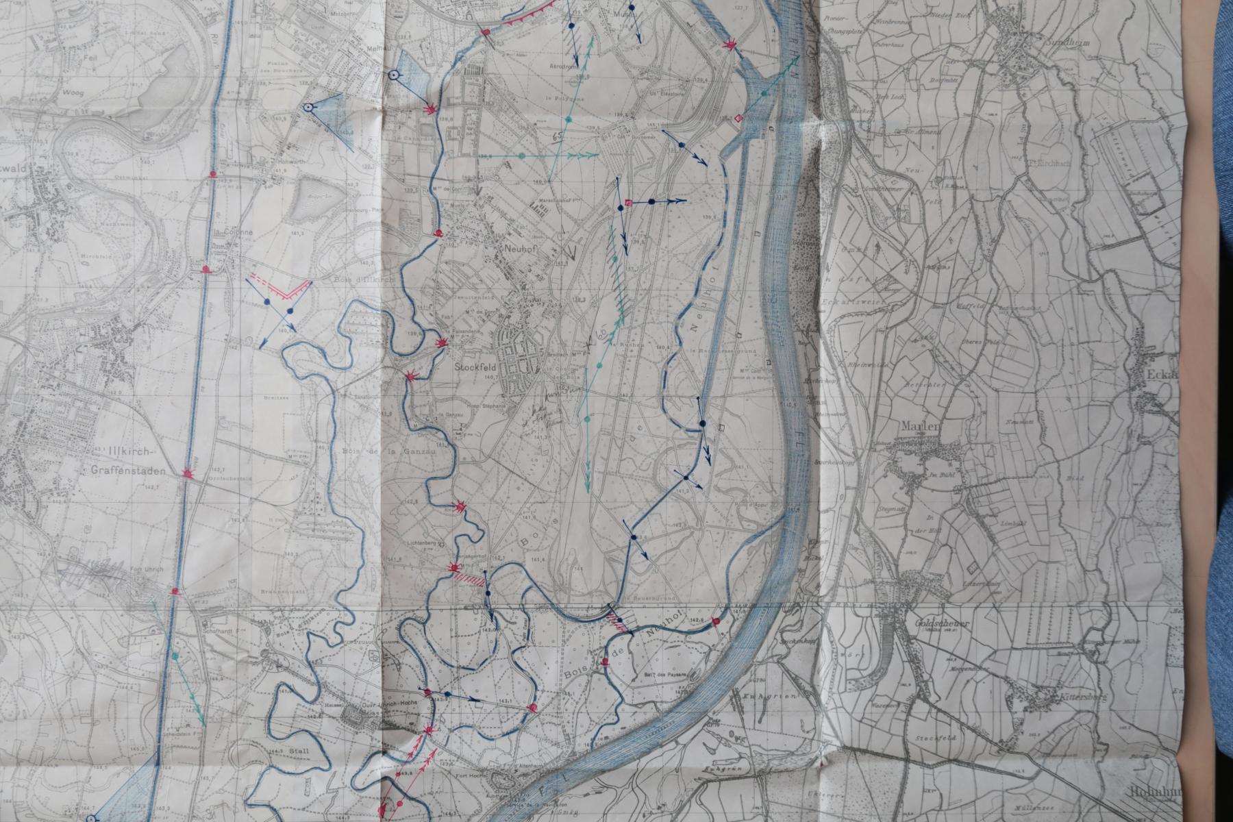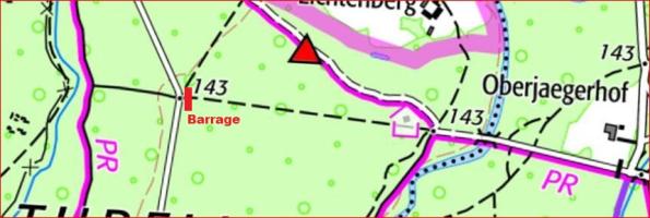 Un grand merci à Antoine pour la carte. J'ai un peu de mal avec les symboles des objets qui y figurent. Je suppose que la base des flèches est un bloc. Il y aurait donc eu un emplacement de tir dans l'Oberjaegerhof ? Les traits rouges avec sphère accolée sont des destructions de ponts ? Certains ont 4 traits supplémentaires, d'autres pas. As tu la signification ? Et nouvelle visite du secteur, à l'est juste avant le pont près de S6 il y a une bande bétonnée qui aurait pu être un barrage, mais les emplacements ne sont pas visibles. Largeur quasi identique à celle du carrefour 143. Photo jointe