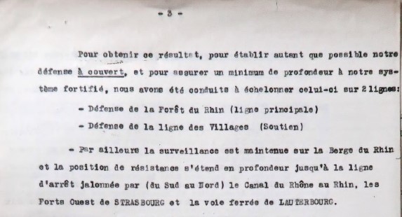 Cette notion de lignes successives est précisée concernant la 10° RM, donc le SFBR, dans les documents de l'Etat-Major de l'Armée, et notamment une note de fin juin 1939 du Gal Bourret (du CSG) au Gal Frère (Cdt la 10° RM et la place de Strasbourg) précisant les travaux d'urgence à mener :