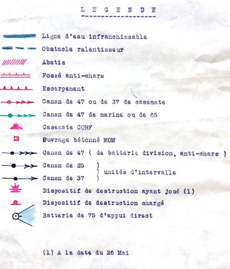 La carte d'Antoine est une carte des défenses anti-char prévues et réalisées par la 103° DIF datée de fin Mai 1940. Tous les points marqués ne sont pas des blocs, mais simplement des positions armées d'un canon antichar. Seules les flèches rouges et/ou un carré rouge semi-plein correspondent à un blockhaus formel. Tu noteras que cette carte ne montre pas les barrages sur route.
