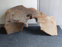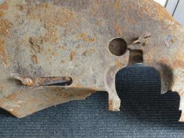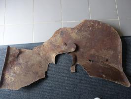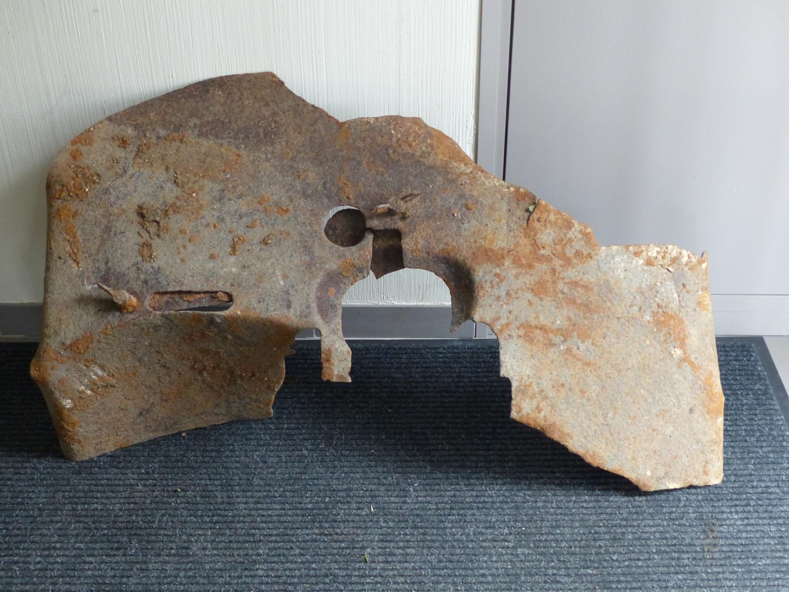 Trouvé ce jour aux alentours d'un blockhaus du village de Villy. Au début je pensais à un bouclier de 25 mm , mais ni l'épaisseur ( seulement 3 mm ) , ni la forme ne correspondent , idem pour un 37 TR mod 16 ( il n'aurait pas été à sa place non plus ) .