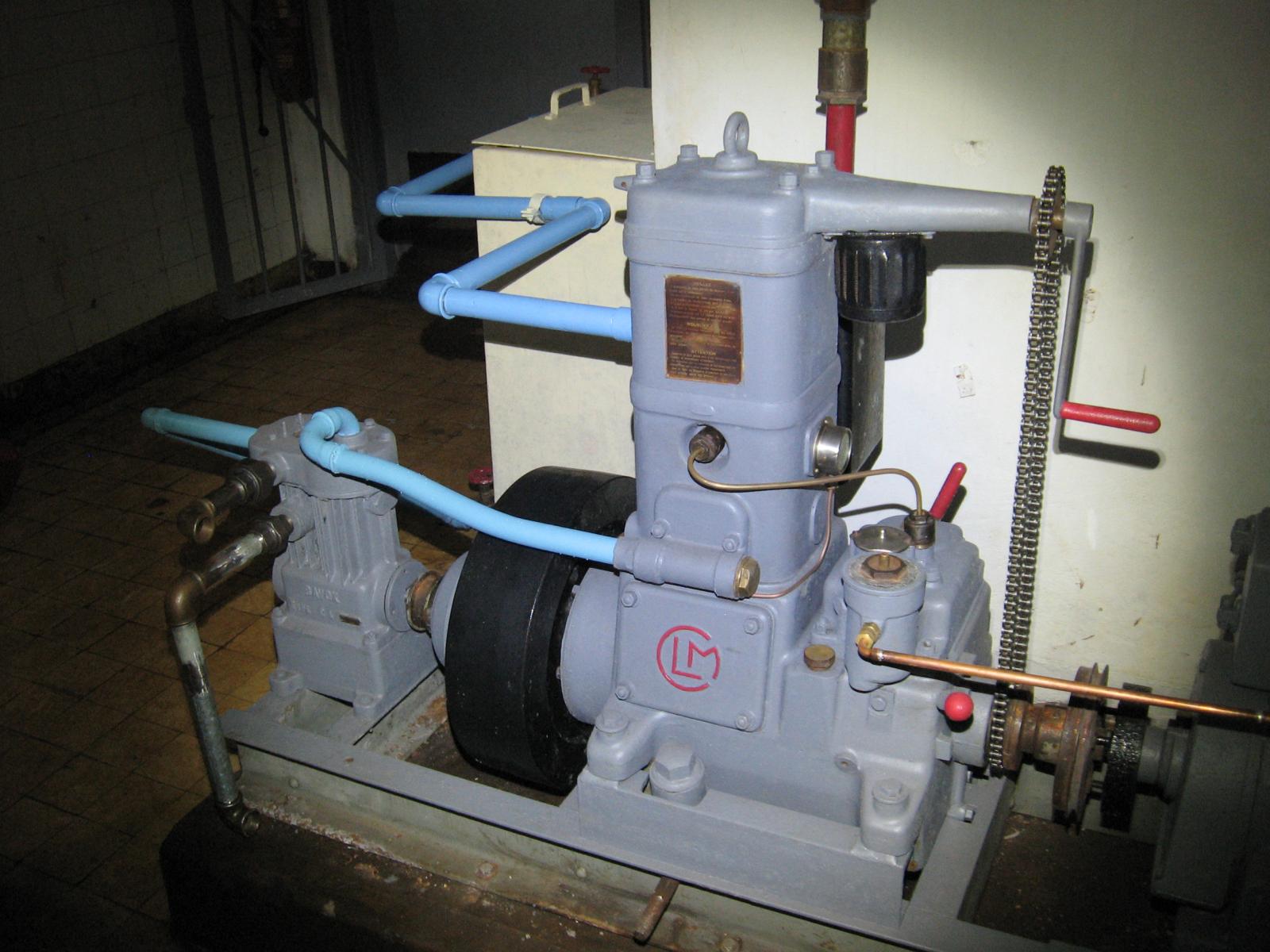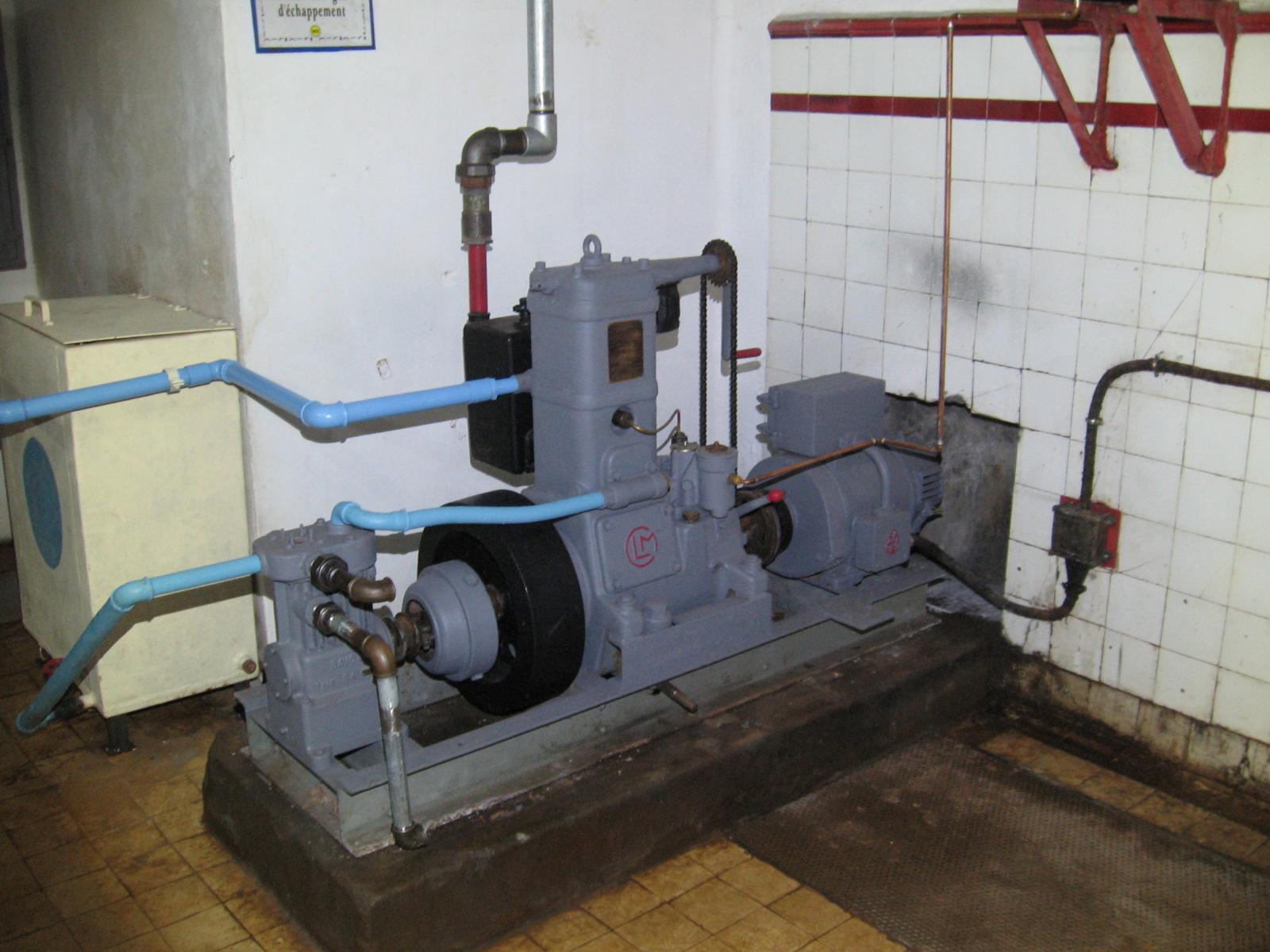 C'est clairement fait pour "ressembler" à un montage standard de groupe auxiliaire de centrale. Ce que tu vois comme une pompe est en fait un compresseur BAVOX avec son circuit de refroidissement. Les deux tuyaux qui sortent dans le vide sont ceux d'air comprimé du compresseur.