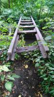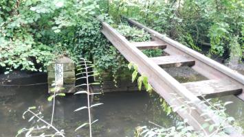 Ces rails sont en fait des rails pour voie normale assemblés par des entretoises en bois. Pour ma part, j'opterai plus volontiers pour un tablier de pont improvisé qui, si l'on se fie à l'état des entretoises est certainement postérieur à la guerre.